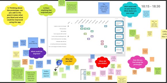 The result was three carefully crafted Miro boards which were used in the online co-design workshops to gather our groups’ opinions on how the app would be used with professionals, which design features would be appealing and appropriate to complete the CATS tasks, how data protection and security could be addressed, and how we could enhance the user-experience for the digital version of this tool. Following the content analysis of all these responses, we then held a showcase to make sure we correctly represented the young people’s voice before feeding all design decisions back to the app creators in the team to develop the next version of the app prototype.