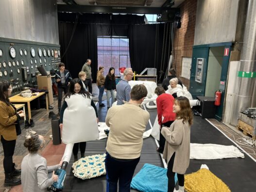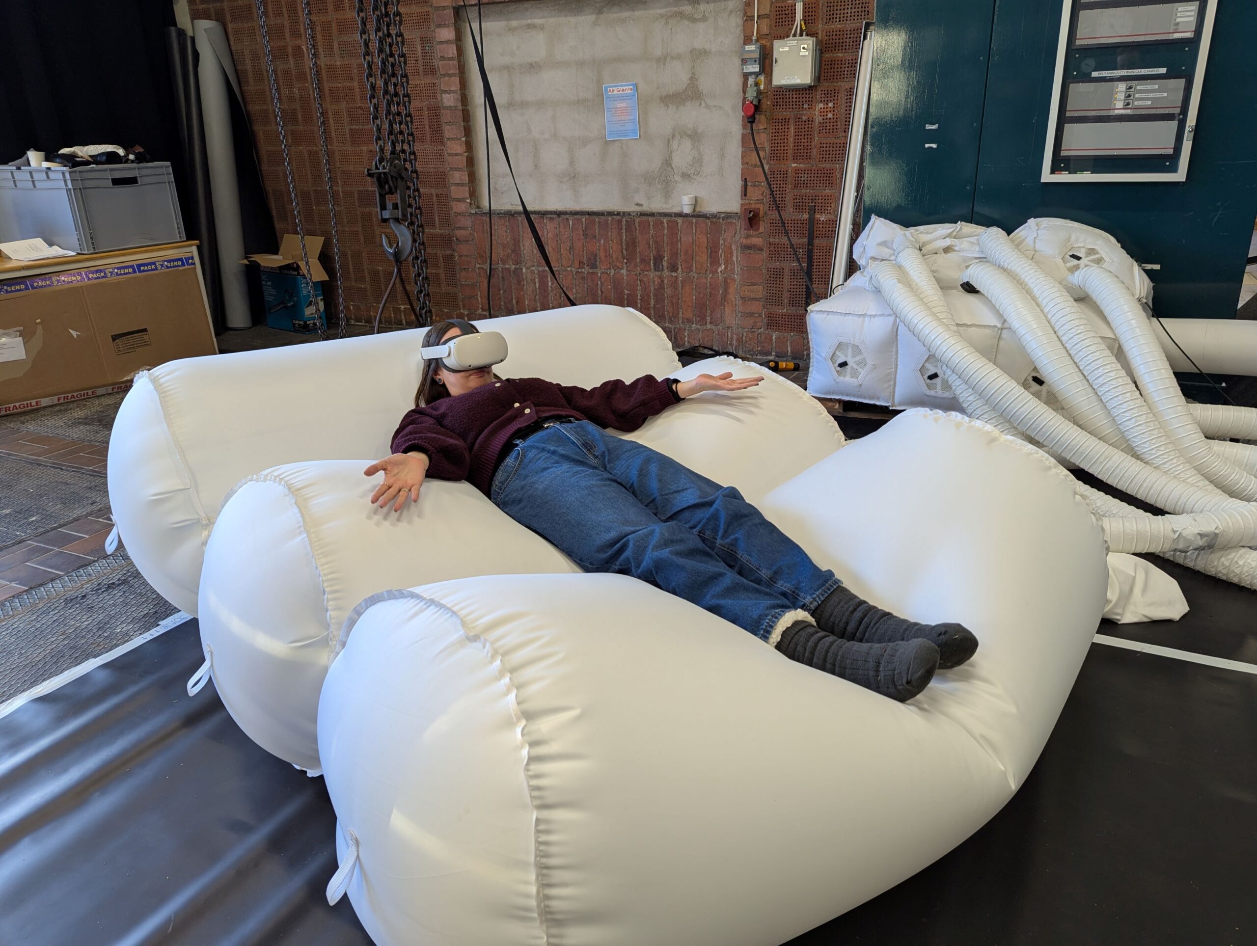 The main event of my visit was a three-day soma design workshop with Air Giants and researchers from KTH, Uppsala University, KAIST, and the University of Copenhagen. Air Giants, an arts company based in Bristol, create enormous, soft, interactive robots. These are big, squishy, playful machines usually seen at festivals. For this workshop, they brought a series of full-body, wearable robot prototypes for us to explore.